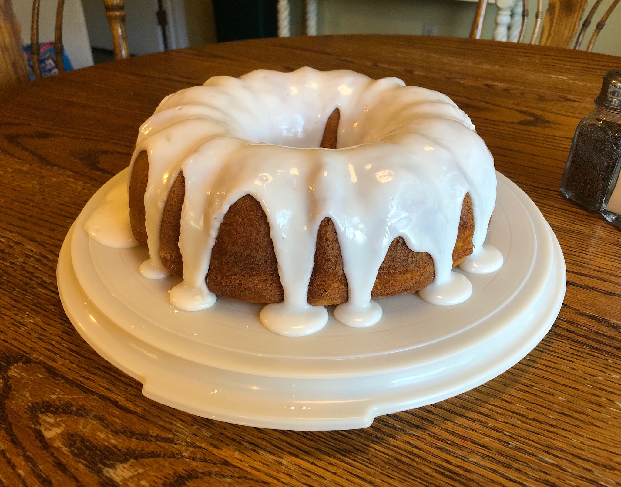 Glaze: Mix together powdered sugar and milk and optional flavoring. Yield is 1 cup of glaze. For thicker glaze, don't use as much milk or add more sugar (this could happen when the humidity is high). And for thinner glaze, add more milk. Remember you want it to stay on the cake not drip down into the cake dish!
