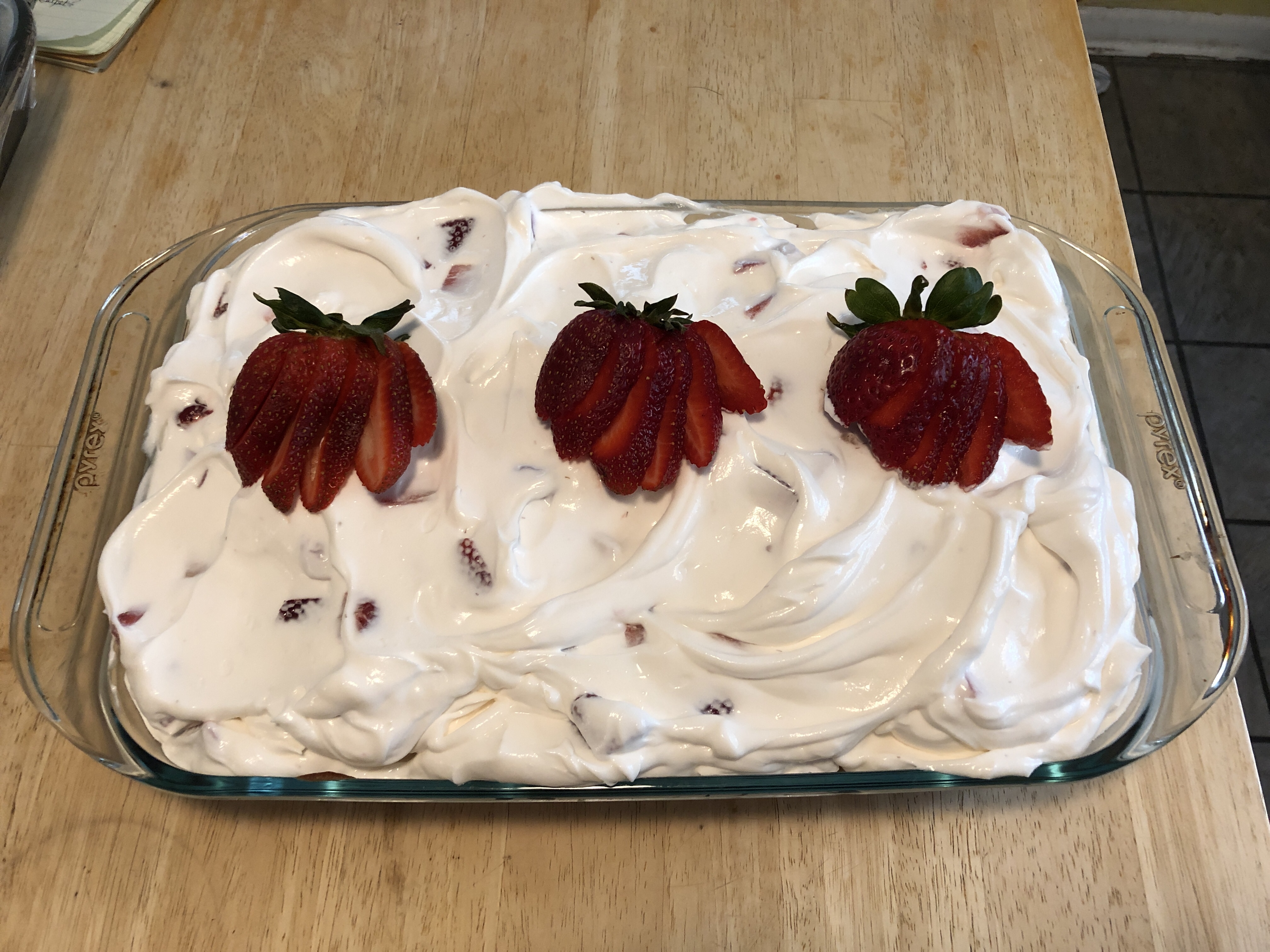 Place the cake, uncovered, in the refrigerator until set (about 30 minutes or more). When you’re ready to serve, cut the reserved strawberries in half vertically and arrange on top of the cake. Or, you could make little strawberry fans by making 1/2" vertical slices just under the hull and then fan them out.
