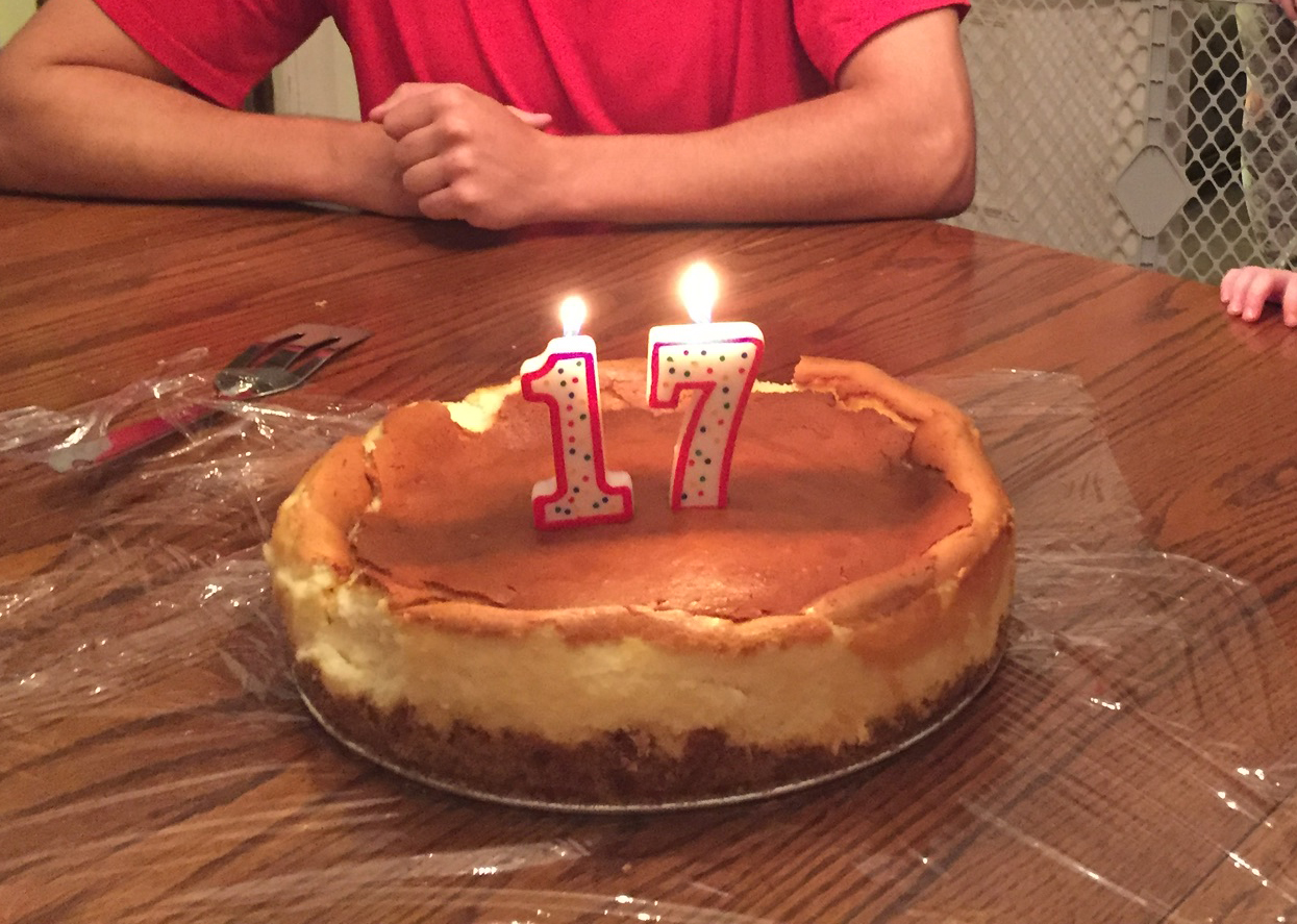 For frosting: in a small bowl, mix together chocolate and sour cream. Spread over cake; chill briefly until frosting is set. Optional: shove as much cheesecake in your mouth as you can and then grin widely at your Mom as she takes your picture.