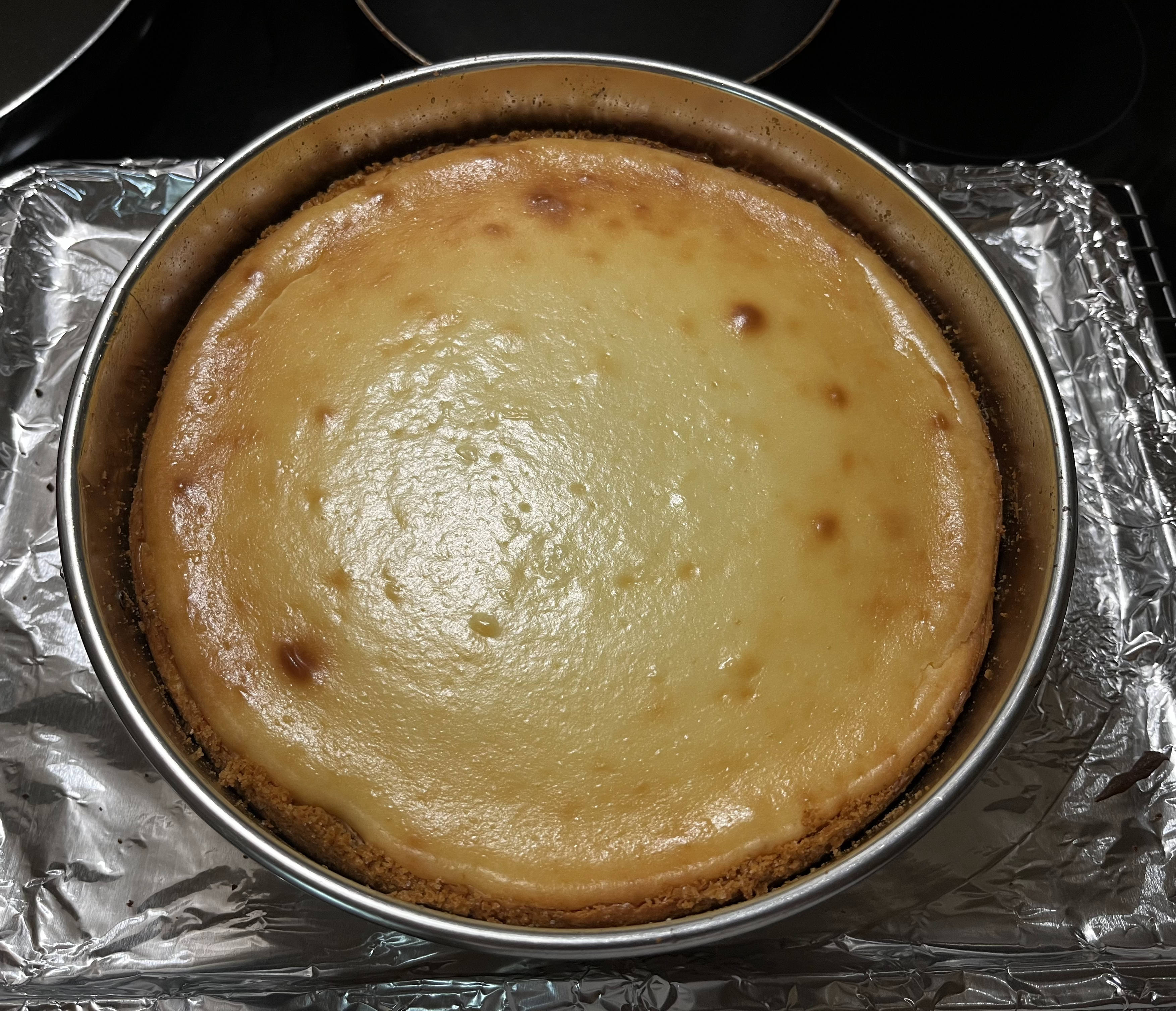Using very hot water, add water to the baking sheet/ until there is about 1 1/2 inches of water around the springform pan. On a rack in the lower 3rd of the oven, carefully move your pan into the oven.