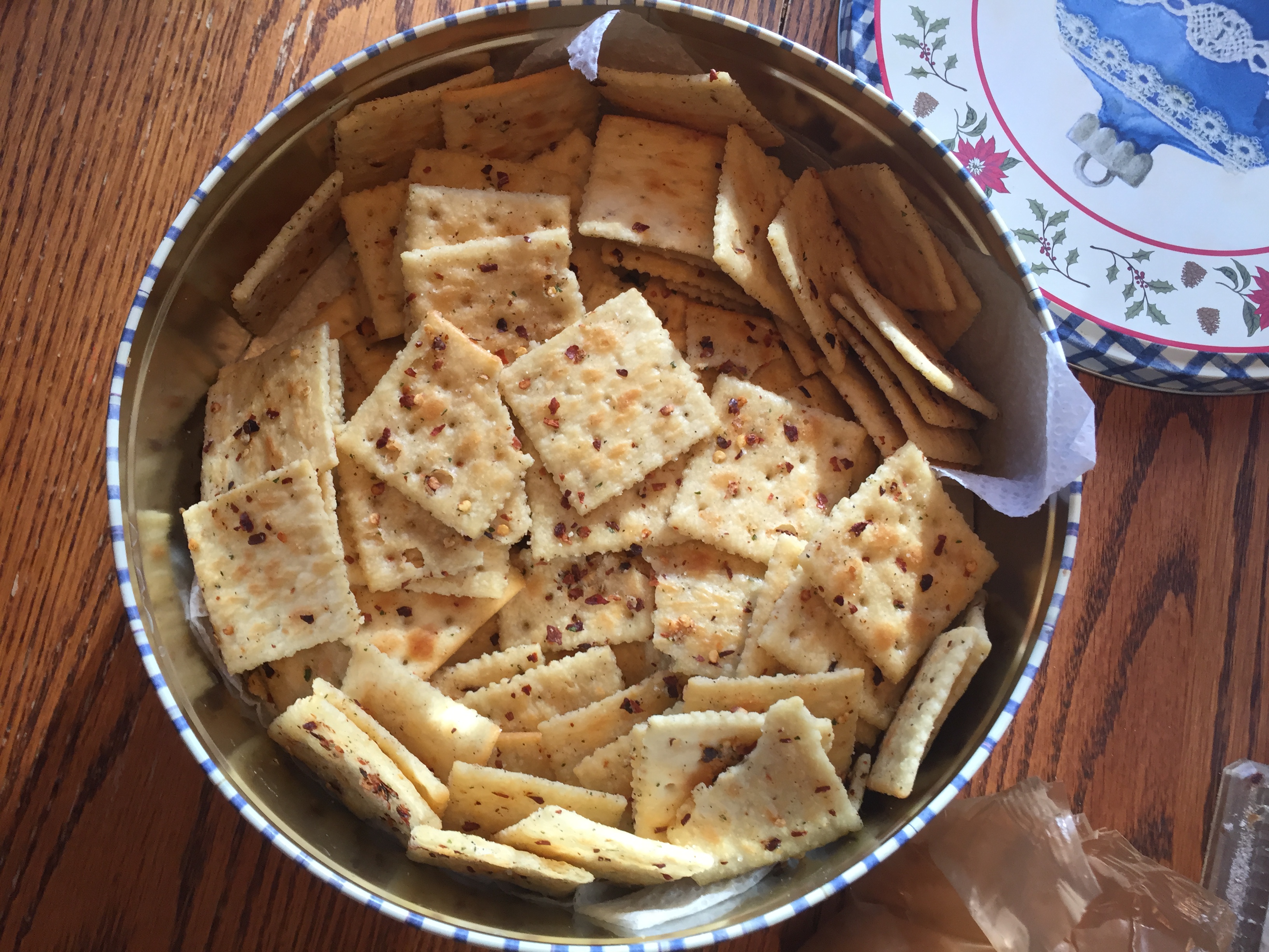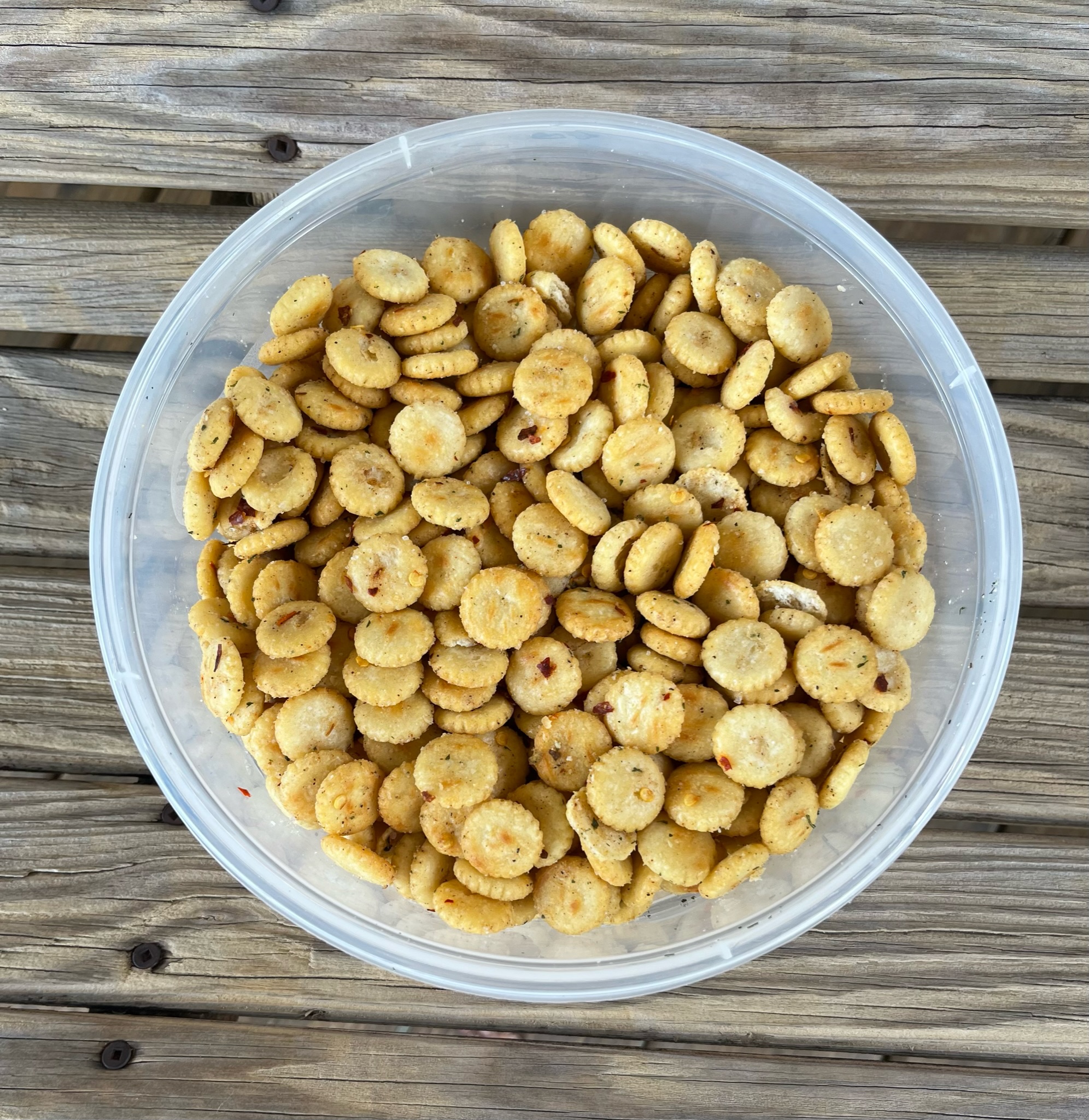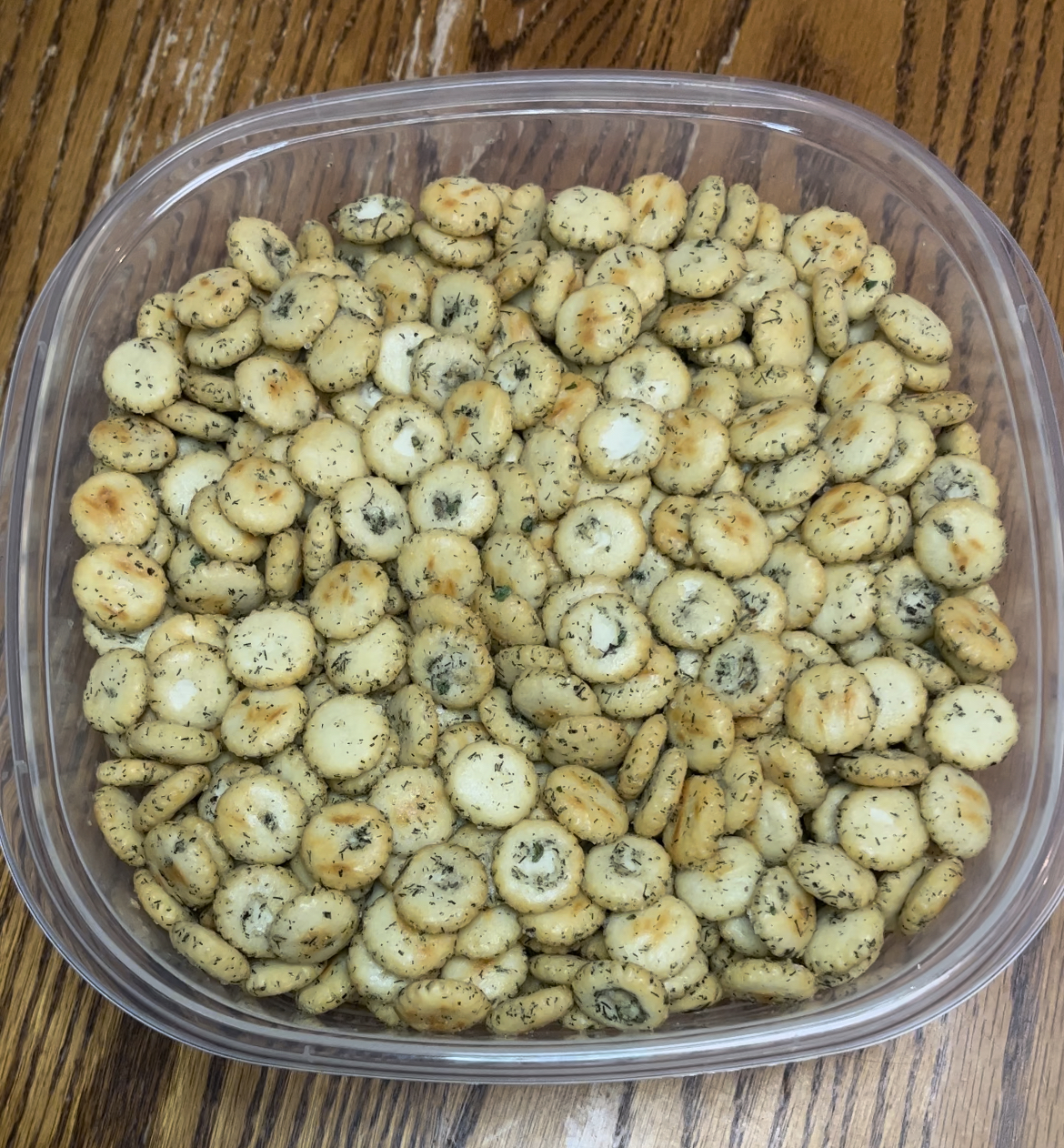 Whisk together oil, HVR mix, dill weed, lemon pepper, and garlic salt in large mixing bowl. Add in crackers and coat them well with oil mixture.