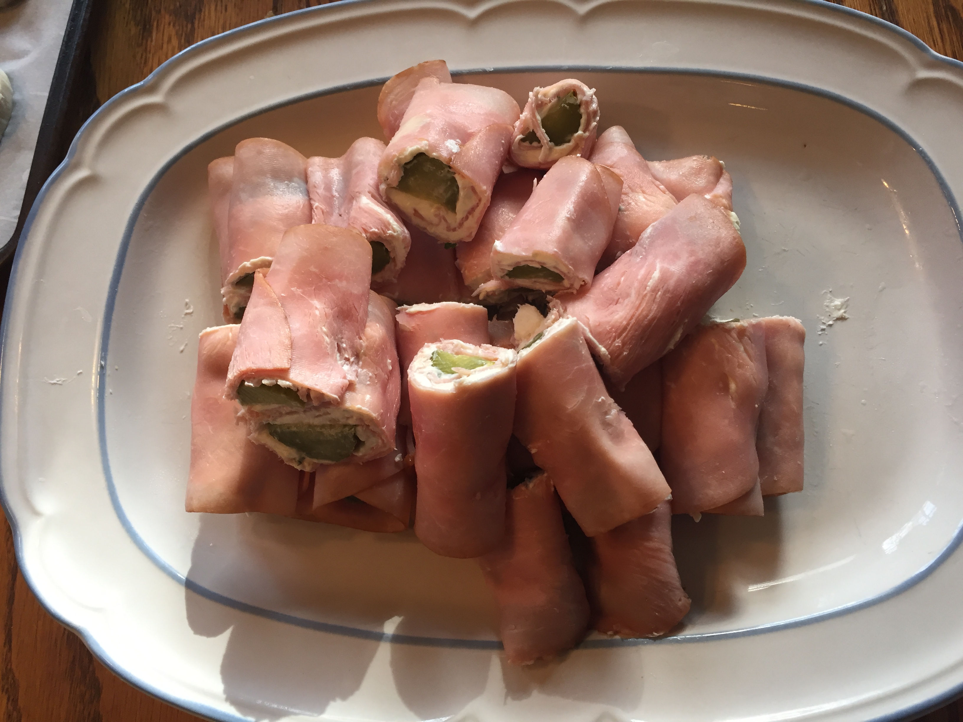 Mix HVR mix with cream cheese. Spread a thin layer of HVR cream cheese mixture onto a slice of ham, then wrap around pickle spear. Repeat until all your stuff is gone.