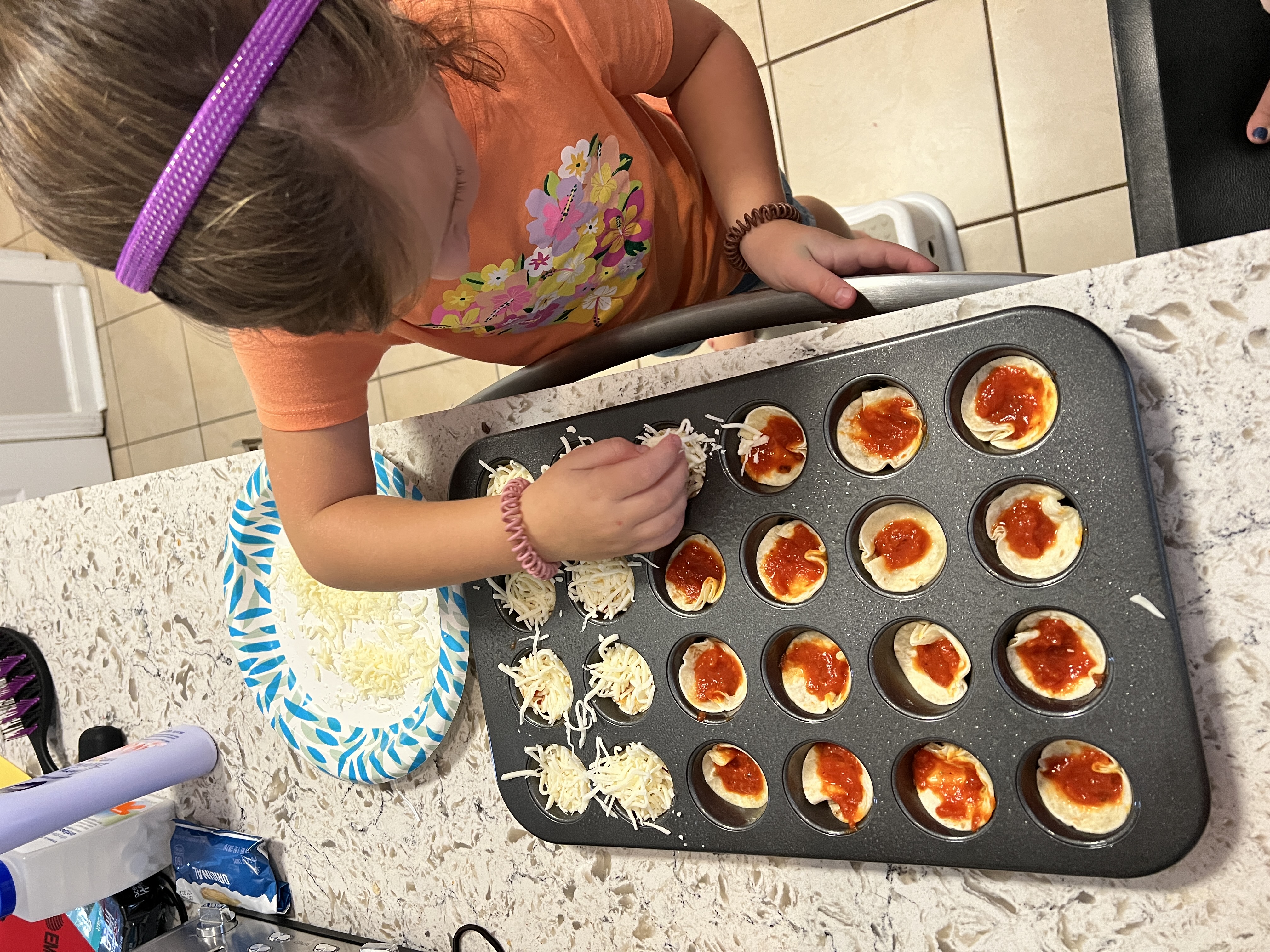 Spray muffin tins with non-stick cooking spray. Place tortillas into muffin tins. Put about 1.5 teaspoons of pizza sauce on top of each tortilla. Layer on the topping of your choice (optional). Sprinkle on mozzarella cheese.