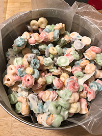 Stir in Fruit Loops and coat with chocolate, then drop by tablespoon onto waxed paper.