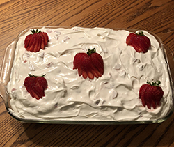Place the cake, uncovered, in the refrigerator until set (about 30 minutes or more). When you're ready to serve, cut the reserved strawberries in half vertically and arrange on top of the cake.