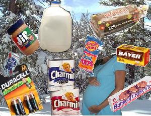 If you're a woman, you also buy toilet paper, beans, a couple of videos, cereal, peanut butter, aspirin, chocolate, and condoms. The toilet paper is for obvious reasons, and the beans are for eatin' and entertainment purposes. The videos, cereal, and peanut butter are for the younguns, and the aspirin and chocolate are to calm your nerves. You get the condoms 'cause the last time it snowed, you conceived Junior in a moment of passion brought on either by boredom or failing batteries in the remote.